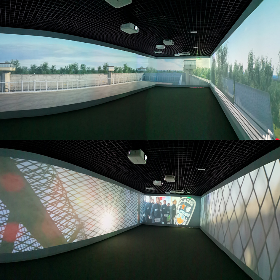 展廳位于基地二層,通過三面環繞的投影融合技術,讓參觀者感受服刑人員一日改造生活,強化身臨其境的體驗感、震撼感、敬畏感,增強遵紀守法意識。