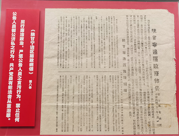 《陜甘寧邊區施政綱領》是抗日戰爭時期陜甘寧邊區的憲法性文件,1941 年5 月中國共產黨邊區中央局提出,同年11 月陜甘寧邊區第二屆參議會正式通過。《綱領》共21 條,其中第8 條規定:厲行廉潔政治,嚴懲公務人員之貪污行為,禁止任何公務人員假公濟私之行為,共產黨員有犯法者從重治罪。